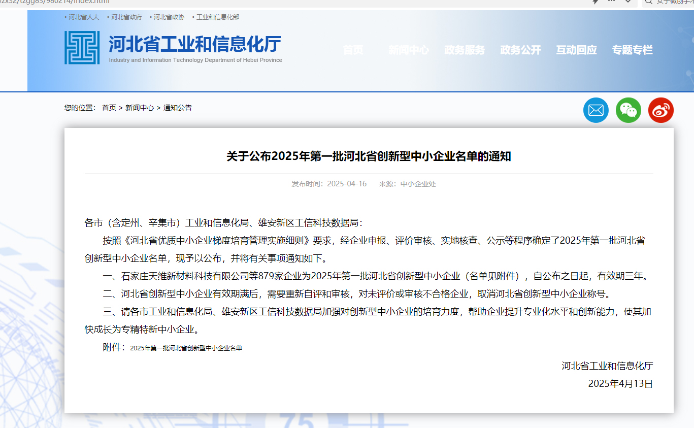 近日,河北省工業(yè)和信息化廳正式公布2025年第一批河北省創(chuàng)新型中小企業(yè)名單。歷經嚴格評審,科好特成功獲得 “創(chuàng)新型中小企業(yè)” 認證。這是科好特企業(yè)在提高企業(yè)自主創(chuàng)新能力、走創(chuàng)新型道路的又一喜人成果,這一榮譽不僅是對科好特在專業(yè)化、精細化、特色化發(fā)展道路上成績的肯定,更標志著公司在創(chuàng)新與高質量發(fā)展領域邁上了新臺階。
